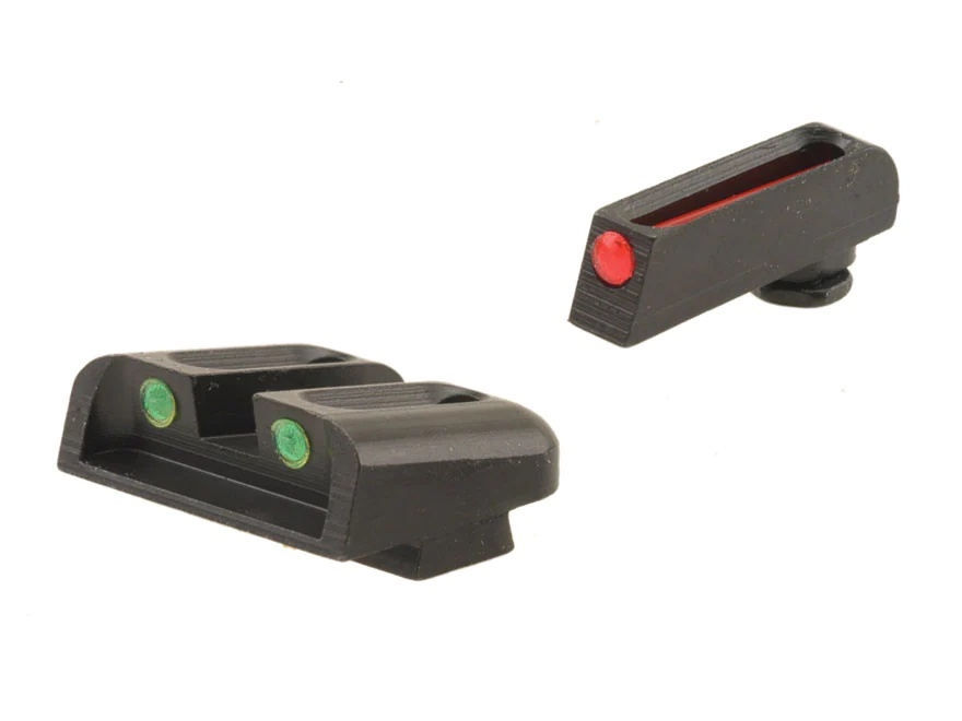 These high contrast fiber optic sights feature a 3 dot pattern with a single front dot and 2 rear dots. Fiber optic technology lets these lights gather ambient light and direct it toward the shooter’s eyes, making the sights glow bright without the need for batteries. Perfect for all types of daylight shooting. The concealed fiber cannot be seen by the target. These sights will fit standard holsters.